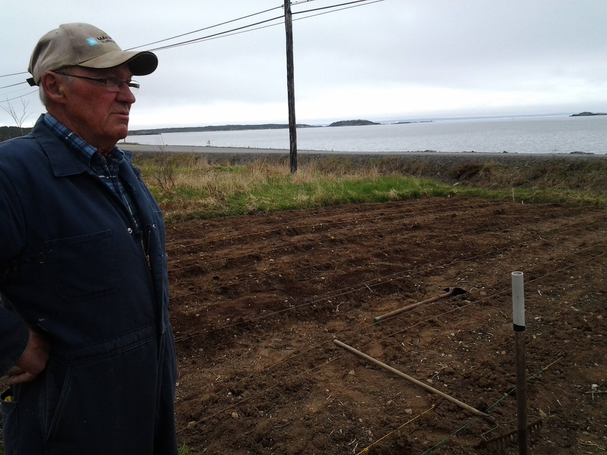 Joe told us the garden was supposed to have been plowed but hadn’t. “I don’t mind,it’s just a of extra work but I’m only 75 years old.” His rows were meticulously strung with line and he was turning in buckets of kelp to fertilize for the year.  I asked if I could take his picture and he obliged, teasing that he hoped it wasn’t to make money. Then he assured me he didn’t mind. As he and Leo chatted, across the road two lobster fishermen were pulling their pots.