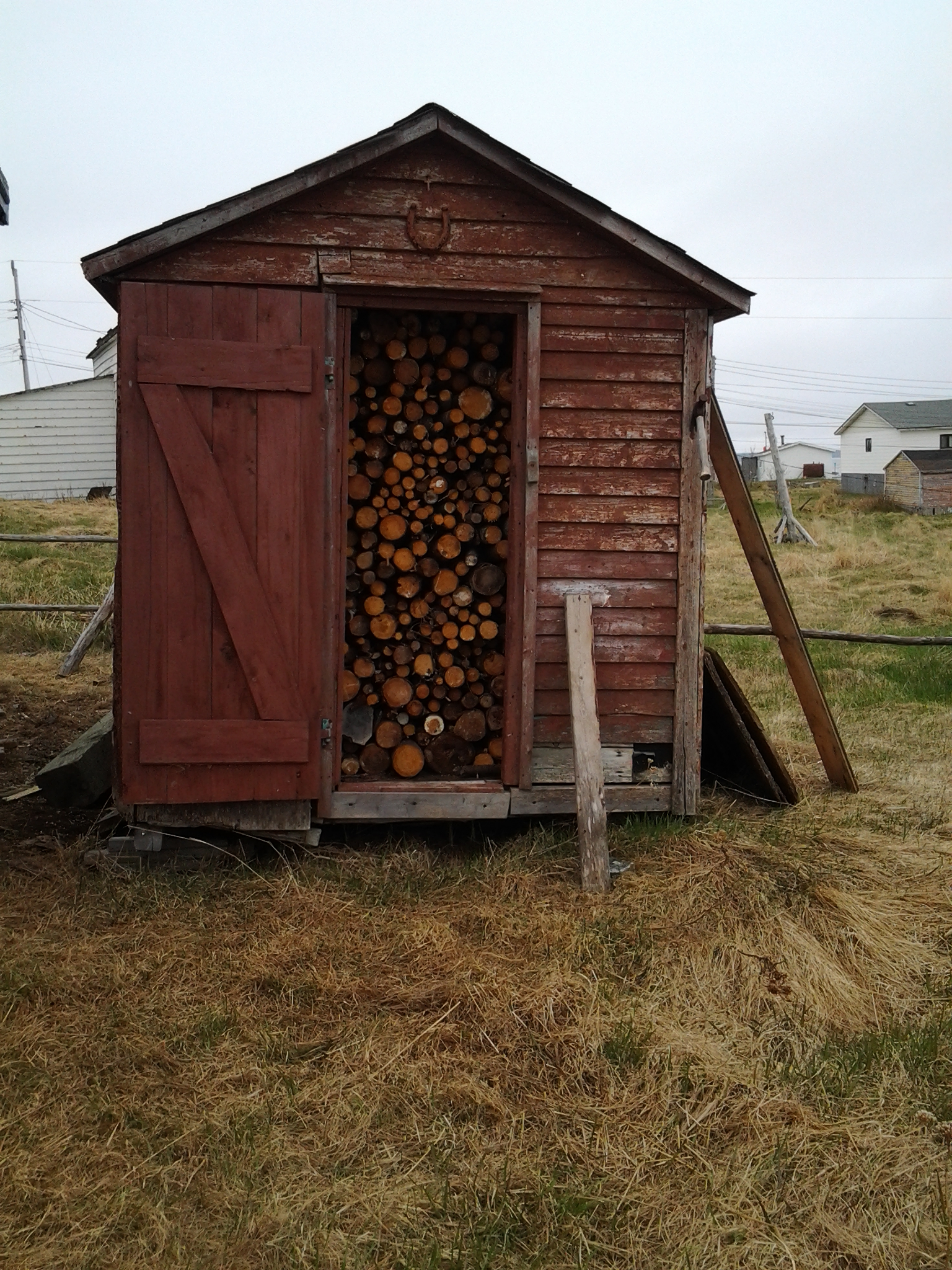 Grub store now serves as a wood shed. Build 50 years ago this August. Must be a story behind knowing that. Island Harbour, Fogo Island